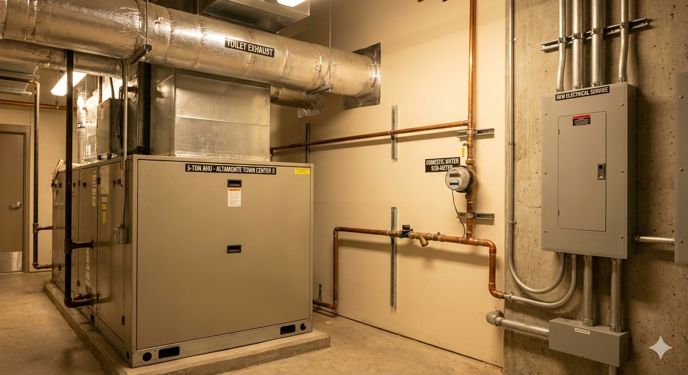 National MEP Engineers was commissioned by the landlord of Altamonte Town Center II to provide MEP design and documentation for a Suite. The project included a new 5-ton Air-Handling Unit (AHU), toilet exhaust, domestic water line with sub-meter, plumbing modifications, and new electrical service. Close coordination with the building structure and architectural team was essential to meet code compliance and a tight two-week schedule.