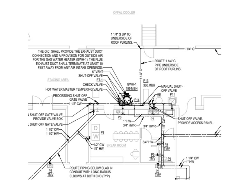 The project also involved a metal building structure, which posed design difficulties for routing plumbing lines, especially in areas where domestic and sanitary piping intersected. The team also had to address accessibility issues for control valves and ensure the system could be maintained without disrupting operations.